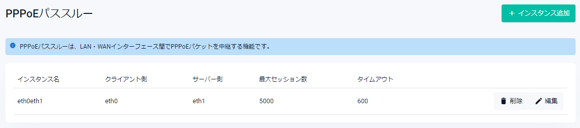 | インスタンス名 | PPPoEパススルーインスタンス名。64文字以内。半角英数字とハイフン(-)、アンダースコア(_)を使用可能です |