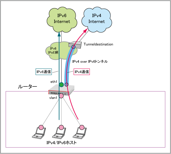 IPoE方式によるIPv4 over IPv6トンネルを構築し、NTT東日本・NTT西日本が提供するフレッツ 光ネクスト回線を経由してIPv4インターネットに接続するための設定例です。