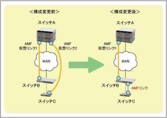 NoteAMF仮想リンクからAMFリンクへ切り替える際に、以下のような構成変更を行う場合は、必ず仮想リンクを2つ以上持つスイッチAから先にAMF仮想リンクの設定を削除してください。