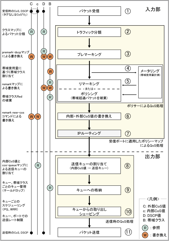CoSとDSCPは、パケットのヘッダーに格納されうる値。パケット受信時にすでに値がセットされている場合もあれば、されていない場合もある。いずれの場合も、QoS処理の過程で変更が可能。
