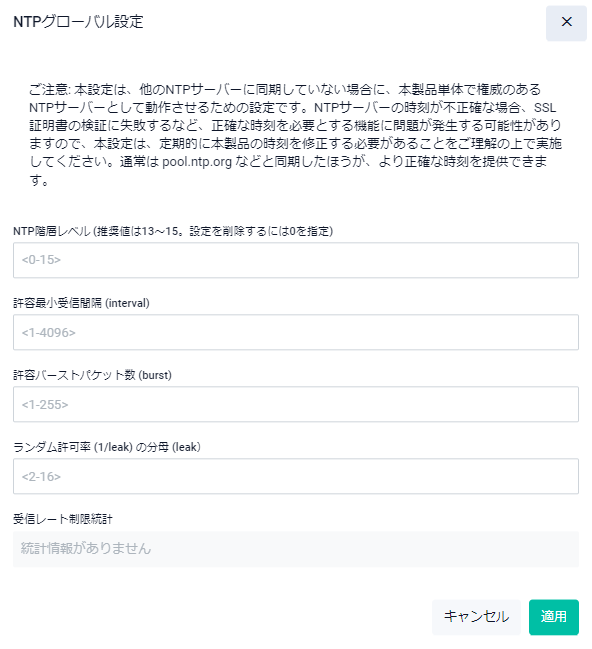 | 「適用」ボタン | NTPグローバル設定を変更して「日付と時刻」画面に戻ります |