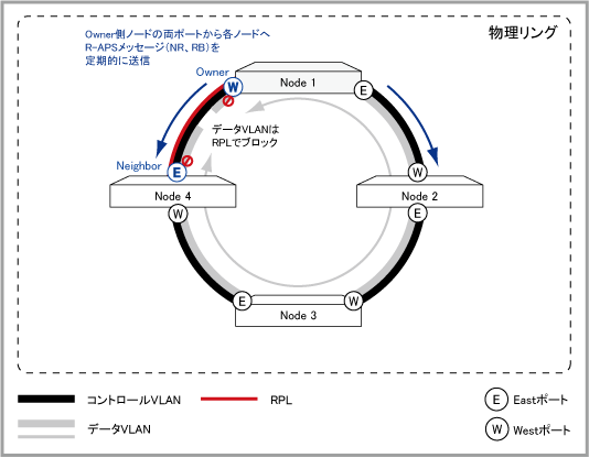 | R-APSメッセージ(NR、RB) | 障害が発生していないことと、RPLがデータVLANに対してブロッキング状態であることを示します。Ownerから同一物理リング内のノードへ送信されます。 |