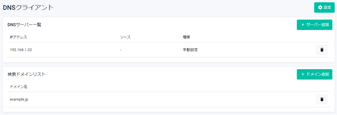 | 削除ボタン | DNSサーバーの登録を削除します。削除前には確認のダイアログが表示されます |