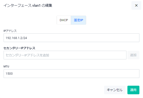 | 固定IP | IPv4アドレスを手動設定する場合はこれを選択してください |