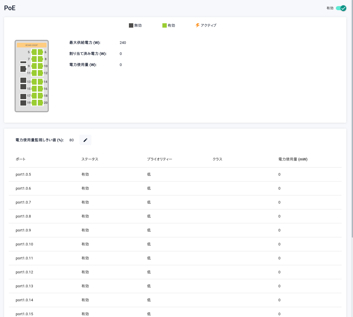 | 無効・有効スライドボタン | システム全体でPoE給電機能の無効・有効を切り替えます |