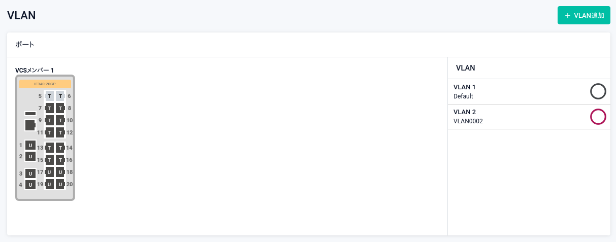 | ポート | 各スイッチポートのタグ設定と所属VLANが視覚的に表示されます。 ・無色U - 初期設定ポート(明示的なVLAN設定のない、vlan1所属のタグなしポート) ・U - タグなしポート(アクセスポート) ・T - タグ付きポート(トランクポート) 各ポートの所属VLANは、該当ポートにマウスカーソルを当てると表示されるポップアップによって確認できます。 また、タグなしポートでは所属VLANが「VLAN」一覧の色でも示されます。 一方タグ付きポートは、「VLAN」一覧で選択中のVLANに所属していれば背景色が該当VLANの色になり、そうでなければ背景色が濃い灰色になります。 ポートをクリックまたはマウスカーソルを当てることで該当ポートのタグ設定と所属VLANの変更およびネイティブVLANの設定をすることもできます。詳細は「タグ設定・所属VLANの変更・ネイティブVLANの設定」をご覧ください |