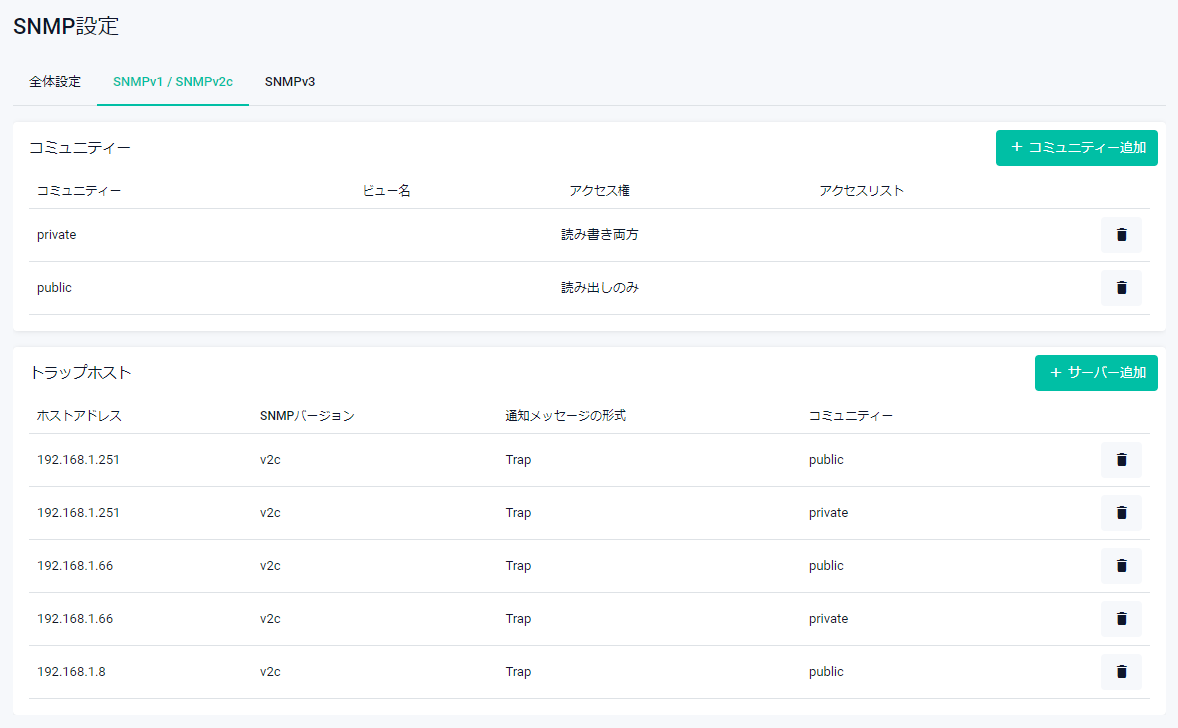 | SNMPv1/v2cトラップホストの一覧が表示されます | |