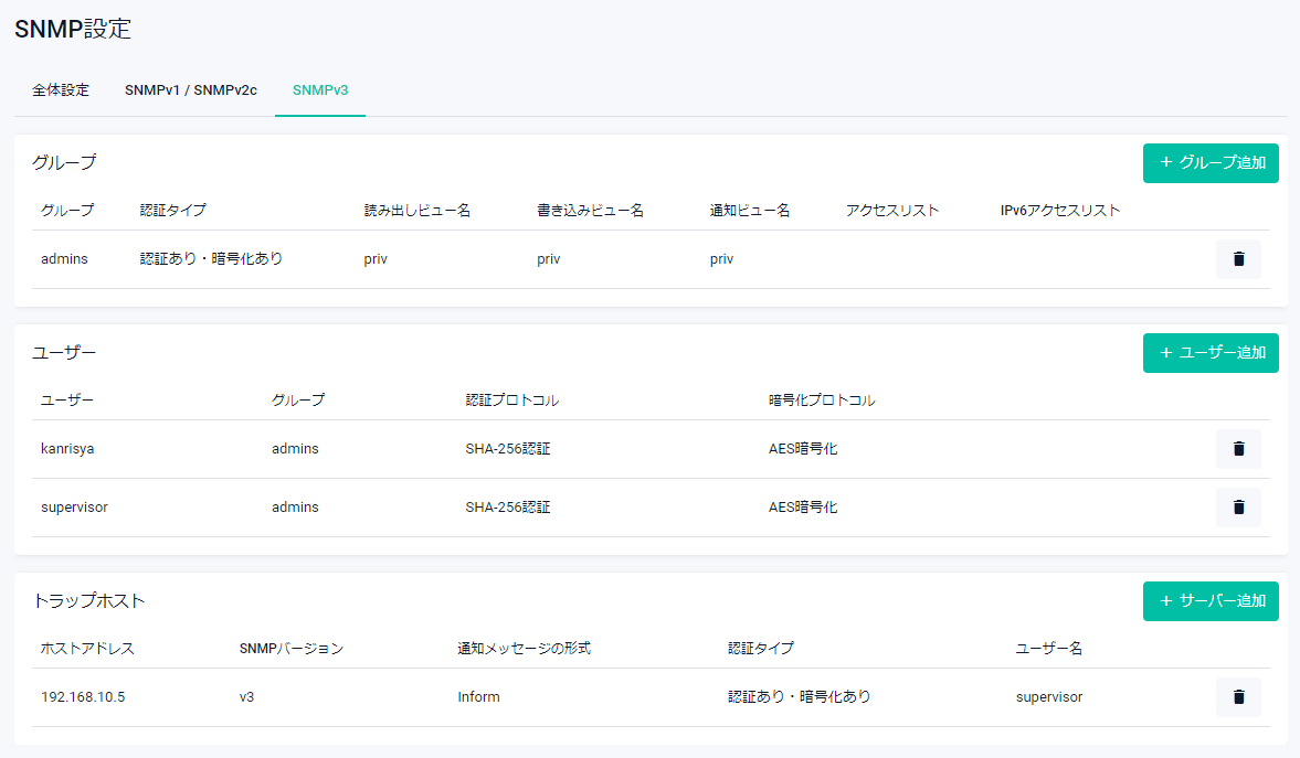 | SNMPバージョン | 該当トラップホストに対して使用するSNMPバージョンが表示されます |