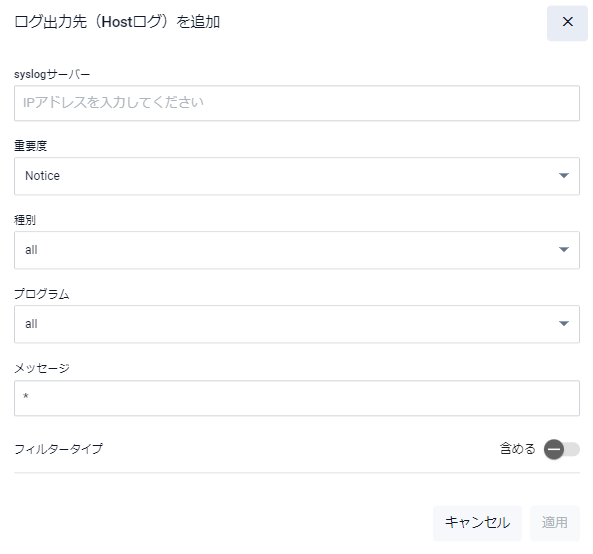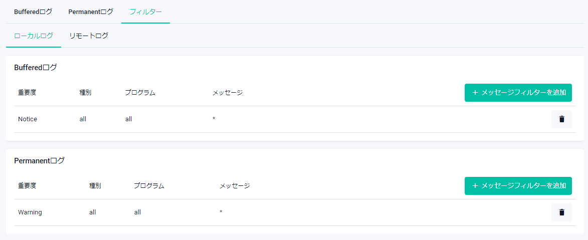 | フィルター | ローカルログやリモートログに対してメッセージフィルターの設定ができます |