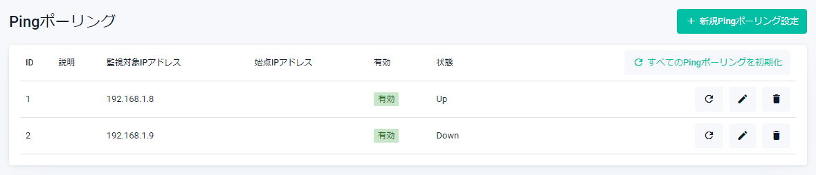 | 有効 | Pingポーリング設定の有効・無効(ポーリング中かどうか)が表示されます |