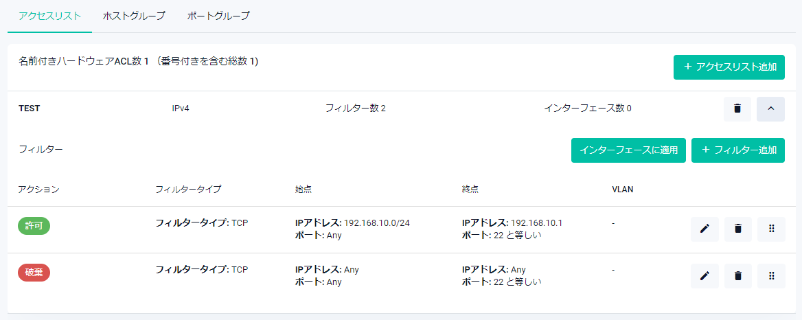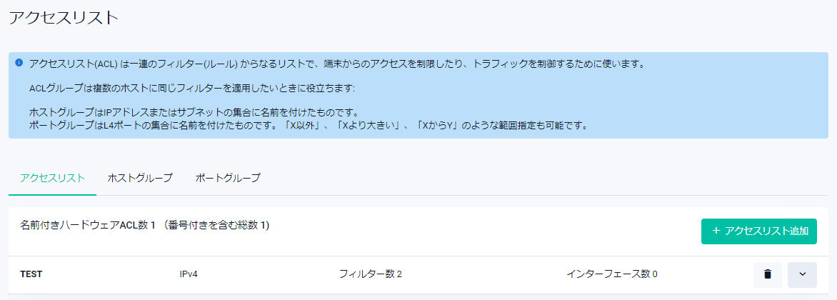 | IPバージョン | アクセスリストのIPバージョンがIPv4またはIPv6で表示されます |