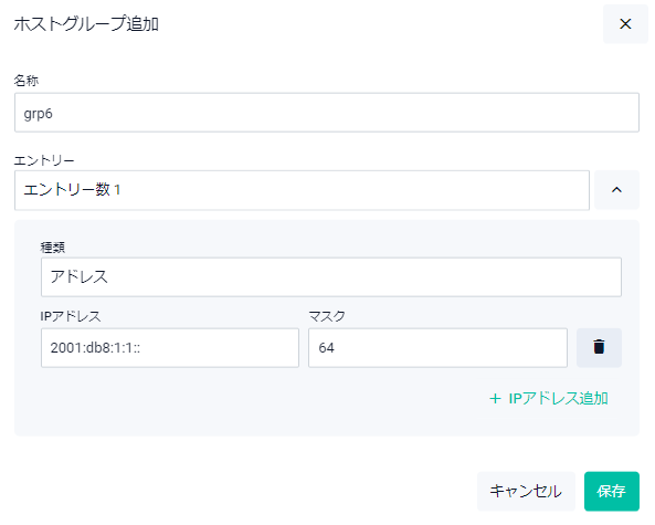 | IPアドレス | エントリーの種類が「アドレス」の場合、対象のIPv6アドレスを入力します |