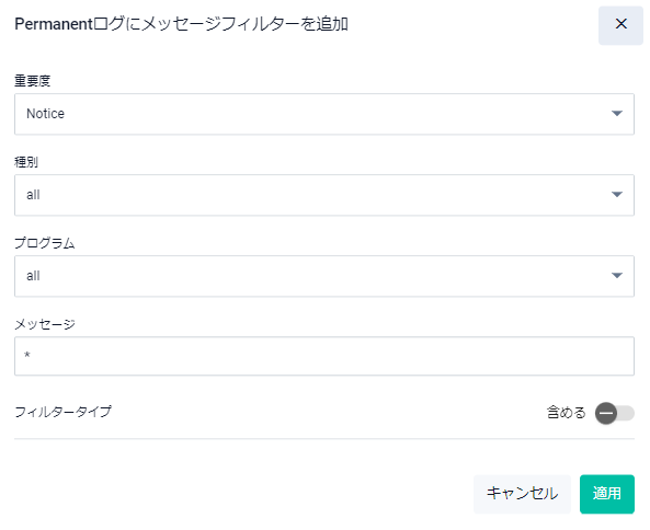 | フィルター | ローカルログやリモートログに対してメッセージフィルターの設定ができます |