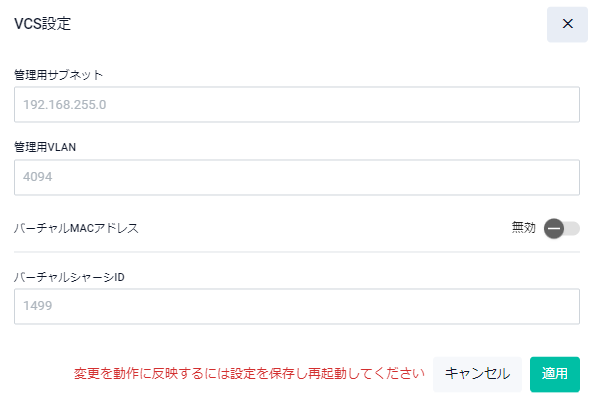 | 管理用サブネット | VCS機能が内部的に使用するVCS管理用サブネットのネットワークIPアドレスを入力してください。サブネットマスクは27ビット(255.255.255.224)固定のため指定する必要はありません |