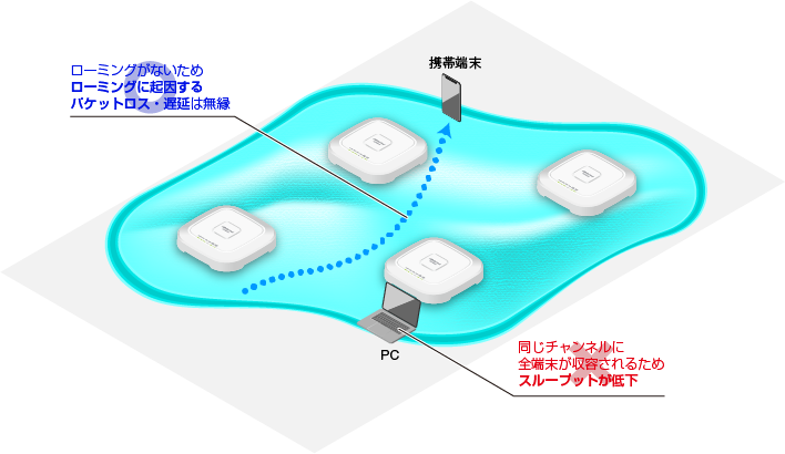 一方で、チャンネルブランケット配下の無線クライアントは、すべて同じチャンネルで通信を行うため、同時に送信を行える無線APは原則として1台のみとなり、ダウンリンクのスループットは低下します。