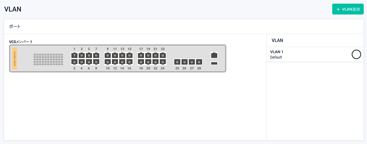 | ポート | 各スイッチポートのタグ設定と所属VLANが視覚的に表示されます。 ・無色U - 初期設定ポート(明示的なVLAN設定のない、vlan1所属のタグなしポート) ・U - タグなしポート(アクセスポート) ・T - タグ付きポート(トランクポート) 各ポートの所属VLANは、該当ポートにマウスカーソルを当てると表示されるポップアップによって確認できます。 また、タグなしポートでは所属VLANが「VLAN」一覧の色でも示されます。 一方タグ付きポートは、「VLAN」一覧で選択中のVLANに所属していれば背景色が該当VLANの色になり、そうでなければ背景色が濃い灰色になります。 ポートをクリックまたはマウスカーソルを当てることで該当ポートのタグ設定と所属VLANの変更およびネイティブVLANの設定をすることもできます。詳細は「タグ設定・所属VLANの変更・ネイティブVLANの設定」をご覧ください |