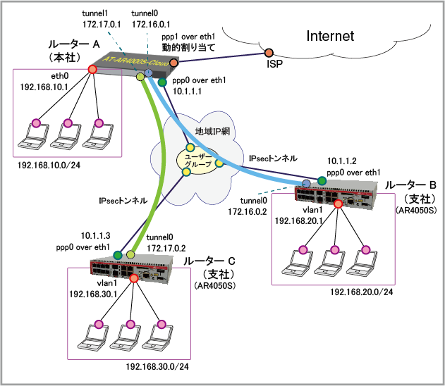 | WAN側(ppp0)IPアドレス | 10.1.1.1/32 | 10.1.1.2/32 | 10.1.1.3/32 |