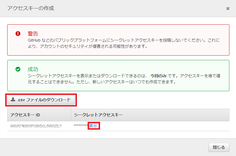 「アクセスキーの作成」画面が表示されるので、「.csvファイルのダウンロード」をクリックして、アクセスキーID、シークレットアクセスキーの情報を保存します。