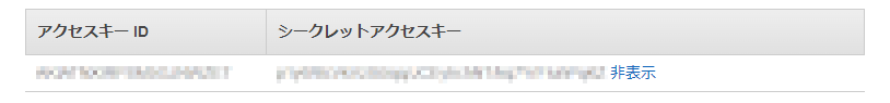 あるいは、前記画面でシークレットアクセスキーの横の「表示」をクリックするとシークレットアクセスキーが表示されるので、アクセスキーIDとシークレットアクセスキーの情報をコピー&ペーストで保存します。