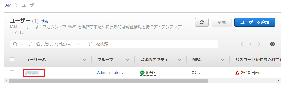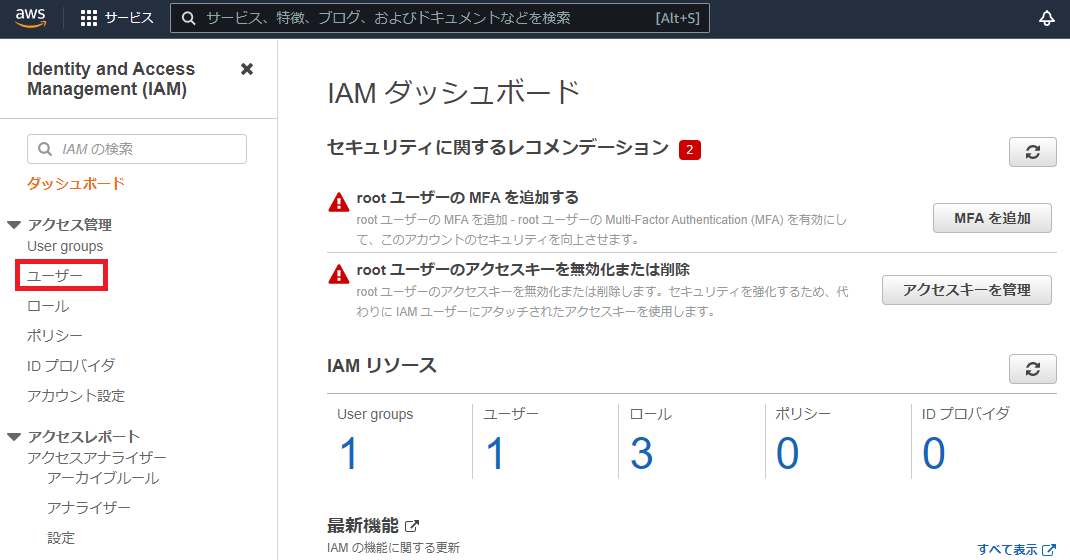 IAMダッシュボード画面で、左メニュー「アクセス管理」の下にある「ユーザー」をクリックします。