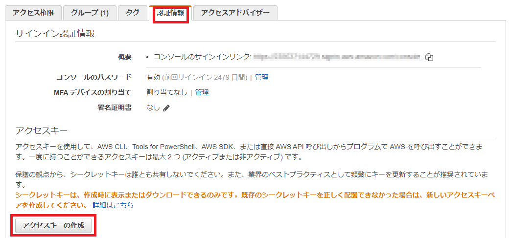 「認証情報」タブに切り替え、「アクセスキーの作成」をクリックします。