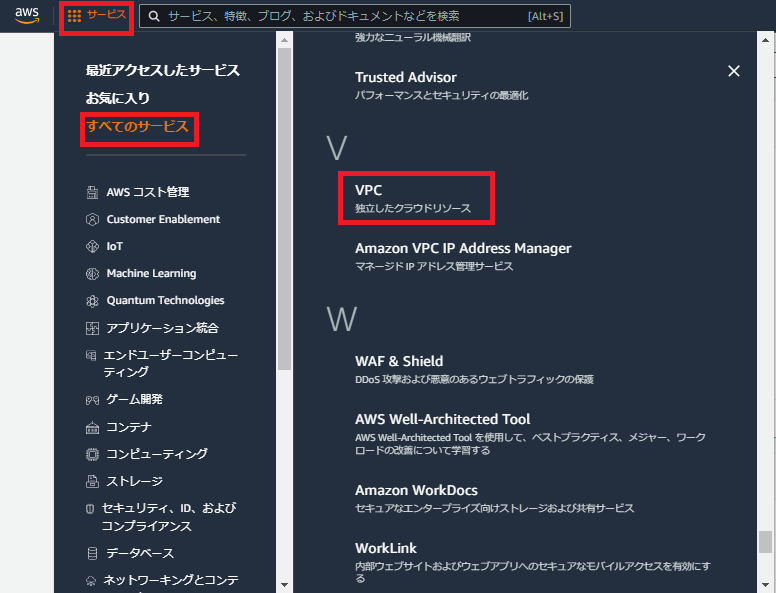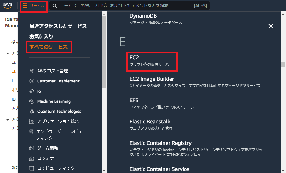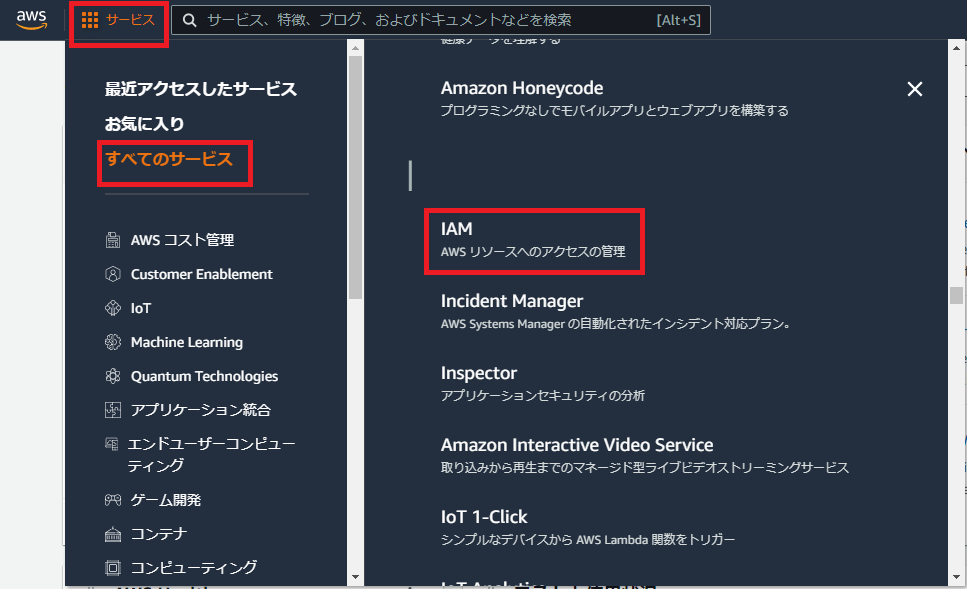 AWSマネジメントコンソールのホーム画面で、「サービス」>「すべてのサービス」>「IAM」の順に選択します。