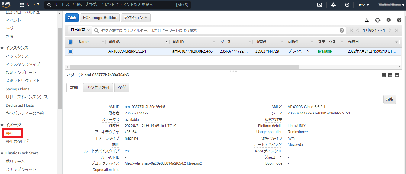 作成したスナップショットイメージは、 [イメージ] > [AMI] で確認できます。