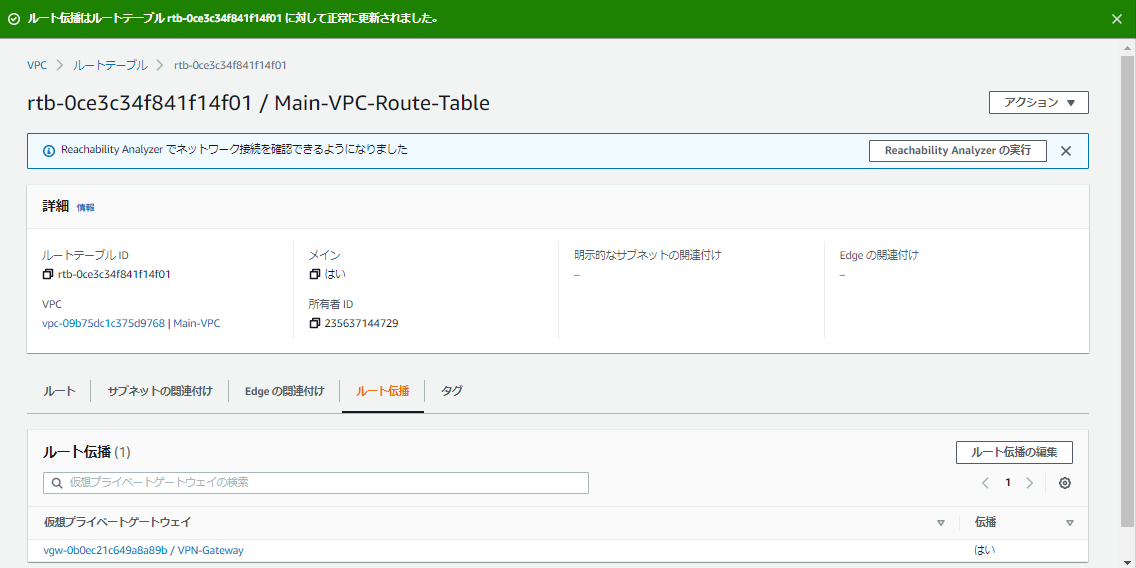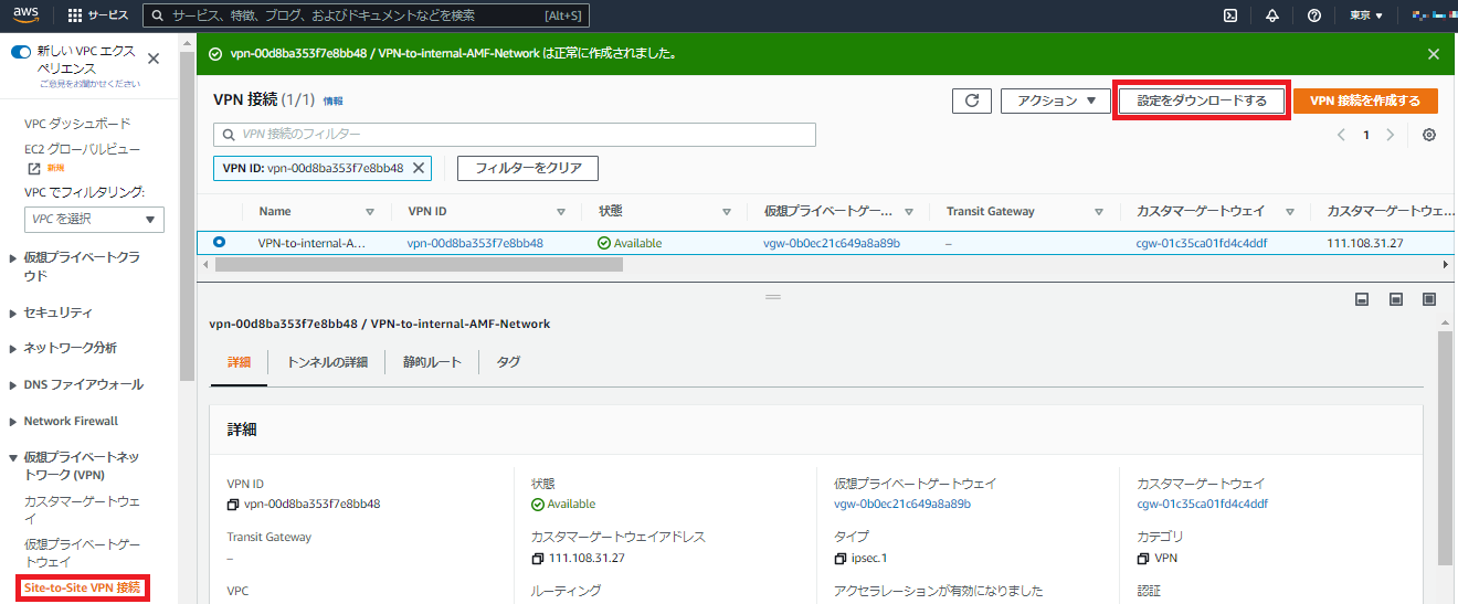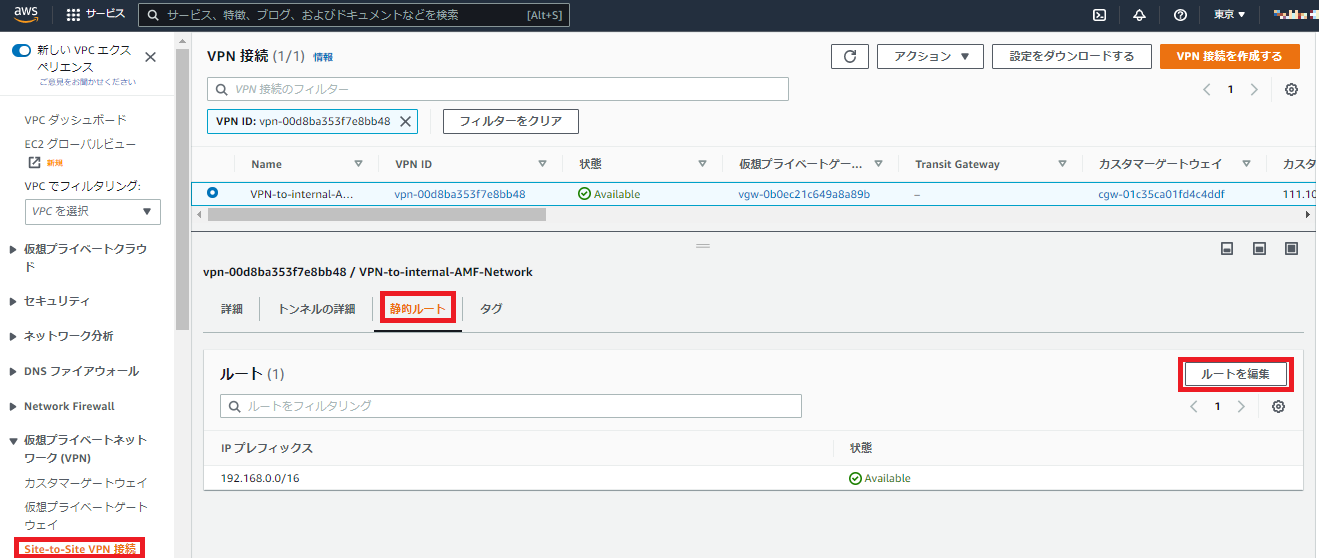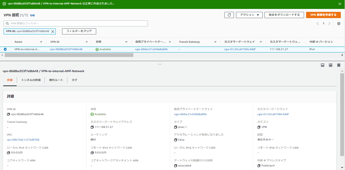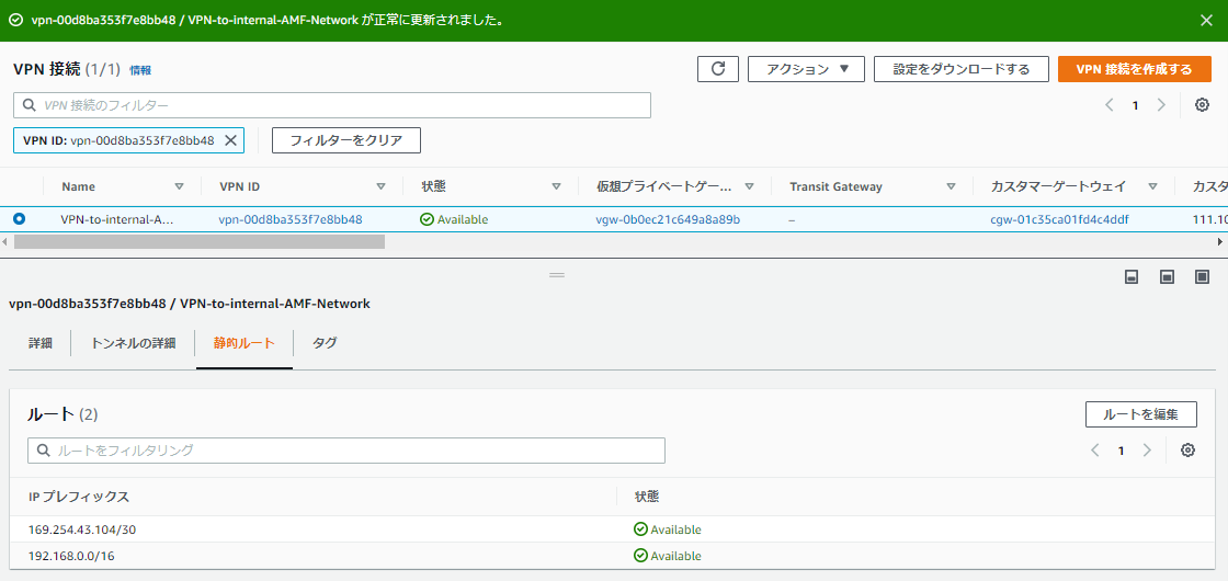 トンネルインターフェースが「UP」の間は、トンネルはピアの状態を追跡しません。つまり、トンネルは、接続を開始する準備、またはピアの開始に応答する準備ができているということです。トンネルが動作しているかどうかを確認するには、AT-AR4050SからAWSルーター(169.254.XXX.XXX)のリンクローカルアドレスにpingを実行してみてください。pingが成功した場合、トンネルはアップしていて作動しています。ルーティングが希望通りに動作しているかどうかを確認するために、他の所望のネットワークにpingを実行してみて、必要に応じてスタティックルーティングを設定してください。