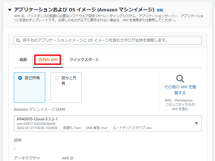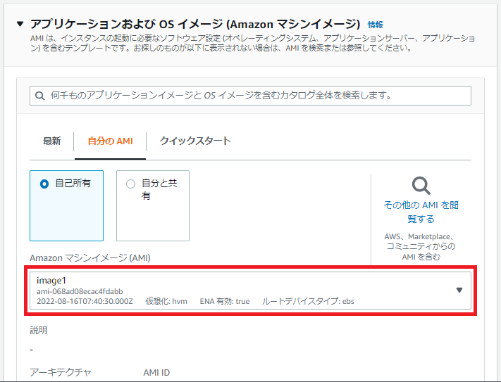 自分のAMIが複数存在している場合、「自分のAMI」タブをクリックしたときに、作成したスナップショットイメージとは異なるものが選択されることがあります。その場合はドロップダウンリストから対象のスナップショットを選択してください。