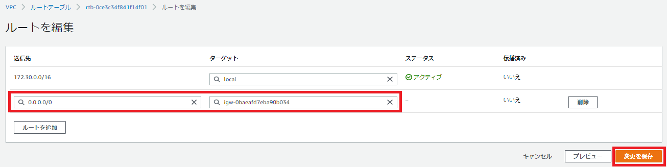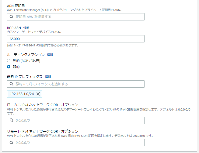 この例では、AR4050Sにデフォルトルートを設定していませんので、次のコマンドでAWSルーターのパブリックIPアドレスおよび本製品が所属するサブネットへのスタティックルートを登録します。