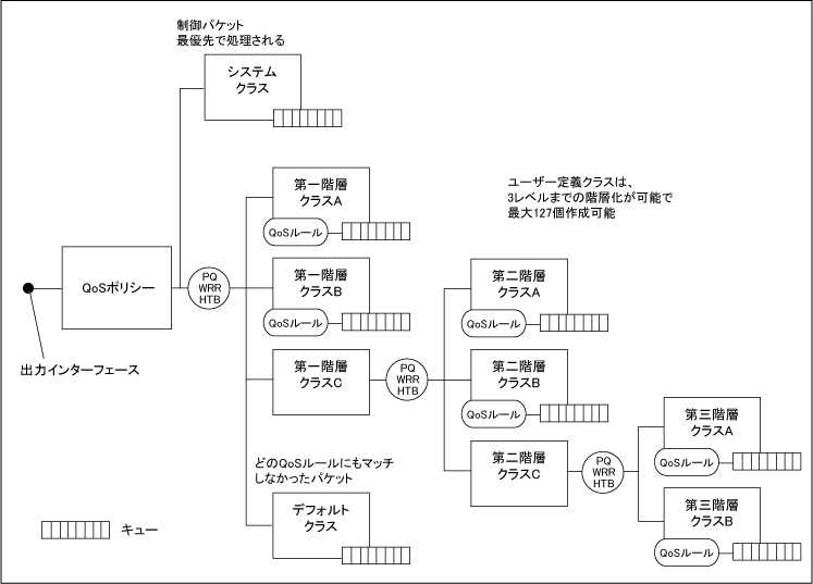 Note出力インターフェースではパケットの分類に基づくマーキングと帯域制御/優先制御が可能です。ブリッジングパケットは初期設定では本機能の適用対象外ですが、ソフトウェアブリッジに l3-filtering enableを設定している場合は、該当ソフトウェアブリッジでブリッジされるL3トラフィックに対して本機能が適用されるようになります。