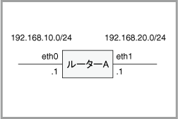 ここで「0.0.0.0/0 [1/0] via 192.168.20.2, eth1」は、「0.0.0.0/0、すなわち、経路表内の他のエントリーにマッチしなかったすべての宛先には、eth1インターフェース上のルーター192.168.20.2(ルーターB)経由で到達できる」の意味になります。スクエアブラケット([])で囲まれた2つの数値は、それぞれ管理距離(Administrative Distance)とメトリックを表します(スタティック経路ではメトリックは使用されないためつねに「0」と表示されます)。また、行頭の「S」は「static」、すなわち「スタティック経路」の省略記号です。「*>」は、該当経路が0.0.0.0/0への最適な経路であり、実際のパケット転送判断に使用されていることを示します。