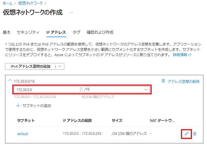 | IPv4アドレスの範囲 | 172.30.0.0/16 |