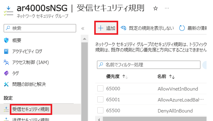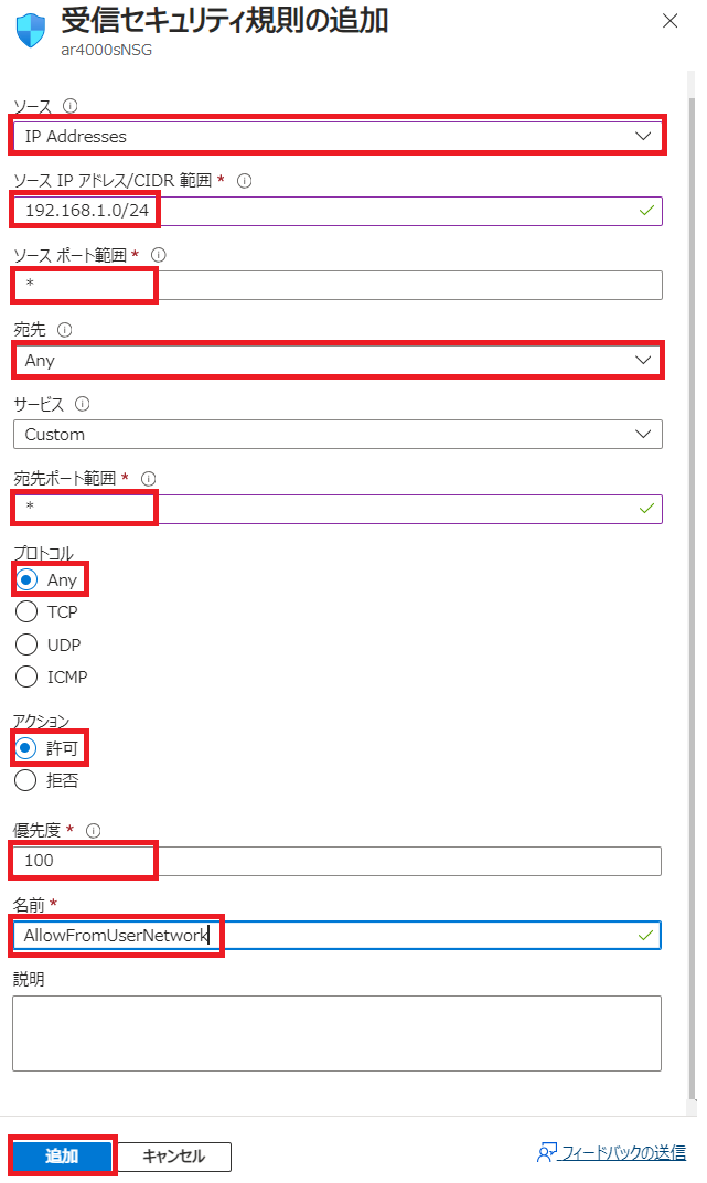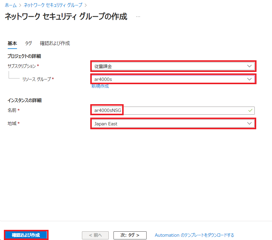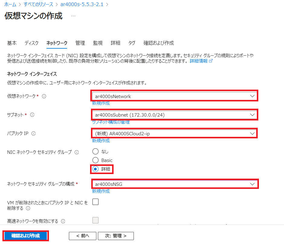 | ネットワークセキュリティグループの構成 | 「ar4000sNSG」を選択 |