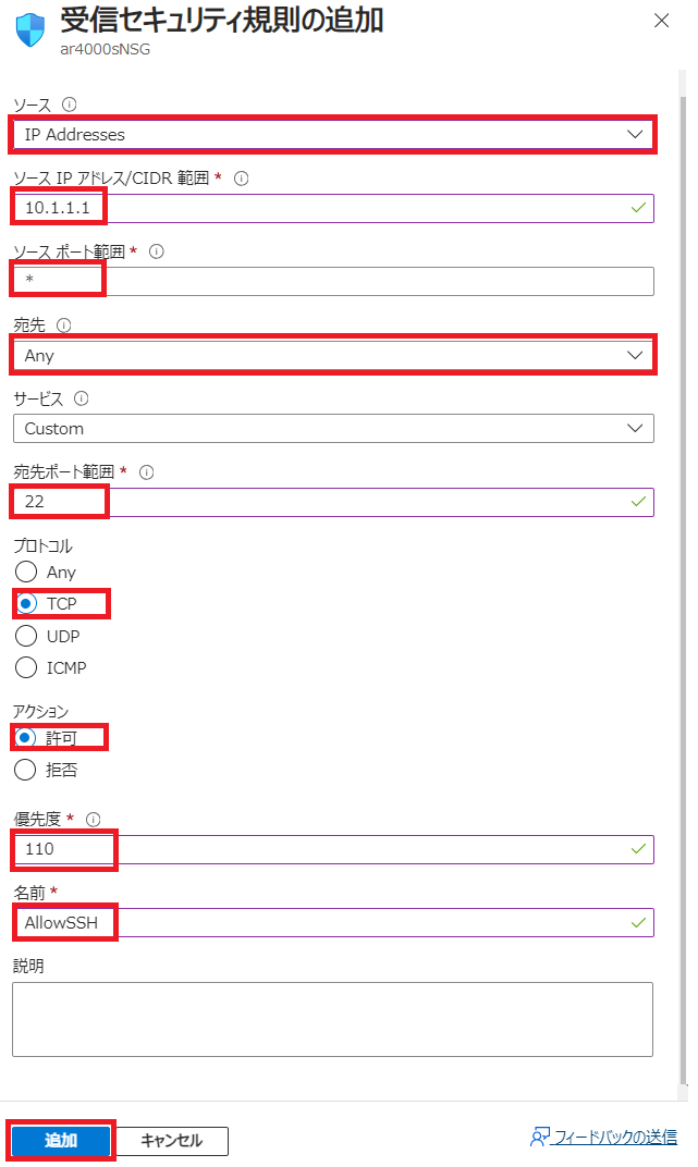 | 110 | AllowSSH | 10.1.1.1(ユーザーネットワーク側ルーターのパブリックIPアドレス) | すべて | SSH (22/TCP) | 許可 |