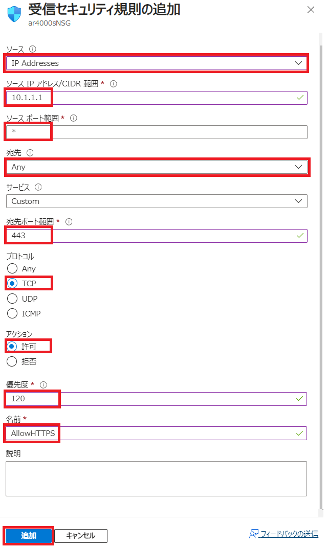 | 120 | AllowHTTPS | 10.1.1.1(ユーザーネットワーク側ルーターのパブリックIPアドレス) | すべて | HTTPS (443/TCP) | 許可 |