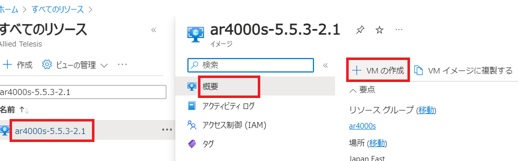 Note本製品(AT-AR4000S-Cloud)仮想マシンのパブリックIPアドレスは、仮想マシンの「概要」画面 や「ネットワーク」画面、「プロパティ」画面などから確認できます。
