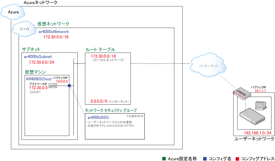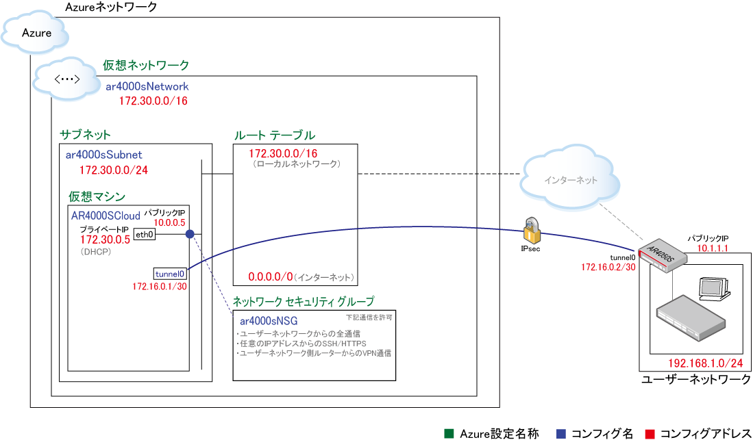 Note以下で説明しているのはAzureとユーザーネットワークを接続するために必要な最小限の設定です。実際の運用時には、ご利用環境の要件にしたがい、ネットワーク セキュリティ グループなどの機能を利用して適切なアクセス制御、セキュリティー設定を追加してください。また、ネットワーク構成についても、実際のご利用環境にあわせた適切な設計を実施してください。