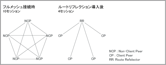 このような制限があるため、BGPスピーカーは同一ASに所属する他のすべてのBGPスピーカーとセッションを張る必要があります。結果としてAS内にはメッシュ状にiBGPセッションが張られることになります。メッシュ構成の煩雑さを避けるための手段として「ルートリフレクション」や「ASコンフェデレーション」があります。