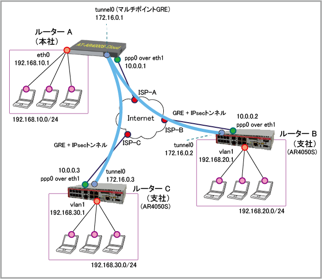 | WAN側(ppp0)IPアドレス | 10.0.0.1/32 | 10.0.0.2/32 | 10.0.0.3/32 |
