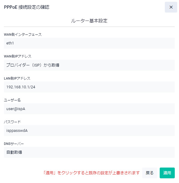 Noteすでにインターネット接続が設定済みの状態で「適用」をクリックすると、ランニングコンフィグ上の既存設定が消去され、新たに設定した内容で置き換えられます。