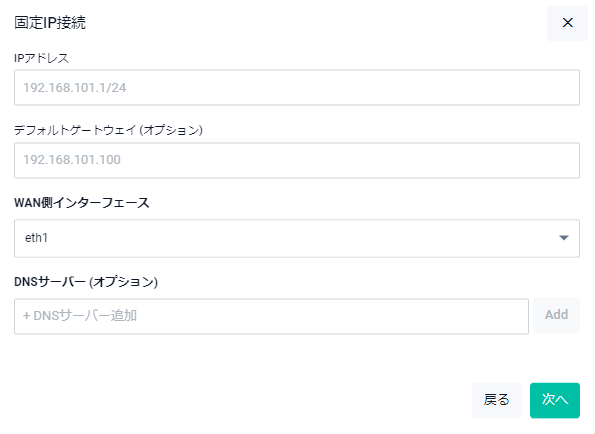 | WAN側インターフェースに設定するIPアドレスを「192.168.101.1/24」の形式で入力してください。 | |