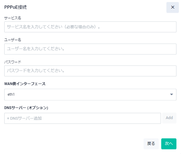 | 名前解決に使用するDNSサーバーを指定します。 PPPoE接続時にIPCPでDNSサーバーアドレスを自動取得する場合はデフォルトのままでかまいません。 固定設定が必要な場合はDNSサーバーのアドレスを入力してから「追加」ボタンをクリックしてください。 |