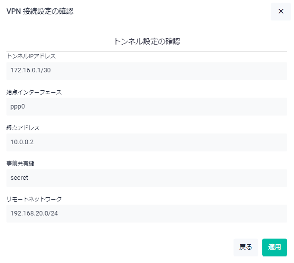 NoteすでにVPN接続が設定済みの状態で「適用」をクリックすると、ランニングコンフィグ上の既存設定が消去され、新たに設定した内容で置き換えられます。