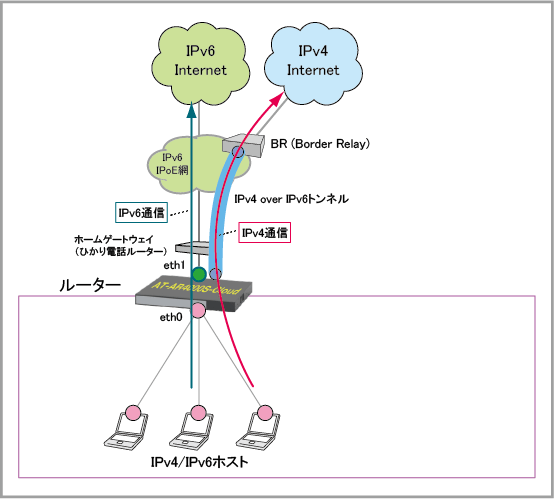 Note”v6プラス” に対応したホームゲートウェイに接続する場合は、ホームゲートウェイの ”v6プラス” 対応機能を無効にした上で本製品を接続してください。ホームゲートウェイで ”v6プラス” 対応機能が有効な場合、本設定例ではIPv4を使用した通信が正しく動作しません。
