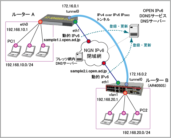 interface tunnel0 tunnel source eth1 tunnel destination sample1.i.open.ad.jp tunnel local selector 1 0.0.0.0/0 tunnel remote selector 1 0.0.0.0/0 tunnel protection ipsec tunnel mode ipsec ipv6 ip address 172.16.0.2/30 ip tcp adjust-mss pmtu