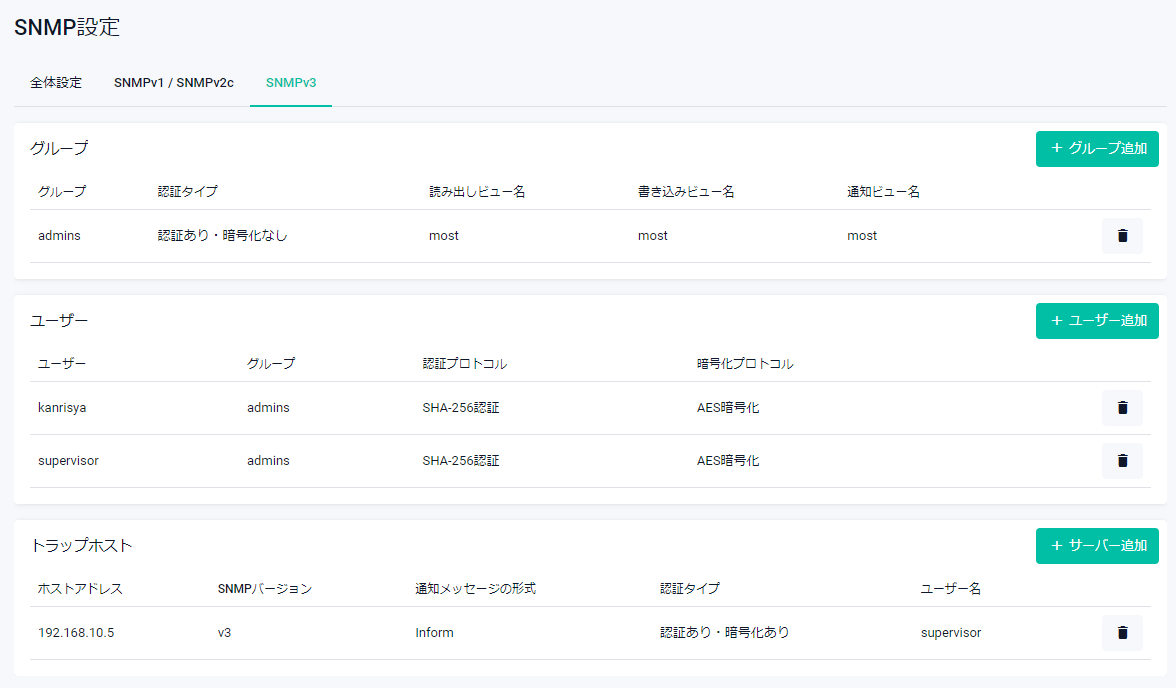 | SNMPバージョン | 該当トラップホストに対して使用するSNMPバージョンが表示されます |