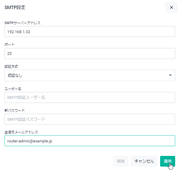 | メールアドレス | パスワード復旧時に使用する新規ユーザーのメールアドレス(@より前のユーザー名は64文字以内)を入力してください。パスワード復旧機能を使用しない場合は空欄でかまいません |