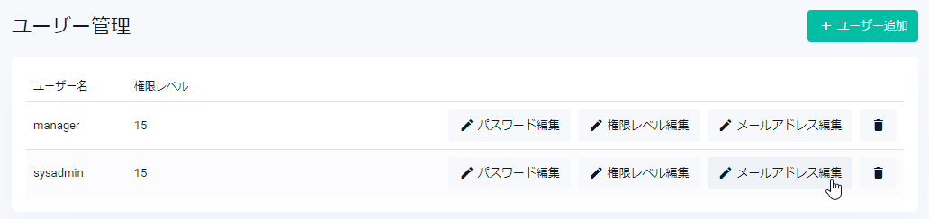 | ユーザー追加ボタン | 新規ユーザー追加ダイアログが開きます |