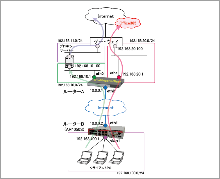拠点側から外部への通信をセンター経由で行う構成において、センター側のルーターAでWebリダイレクト・プロキシーモードを使用し、拠点から外部への通信は原則としてプロキシーサーバーにリダイレクトしながら、Office365の通信だけは例外的にプロキシーサーバーを経由させず、ルーターAから直接ゲートウェイルーターに転送する設定例です。